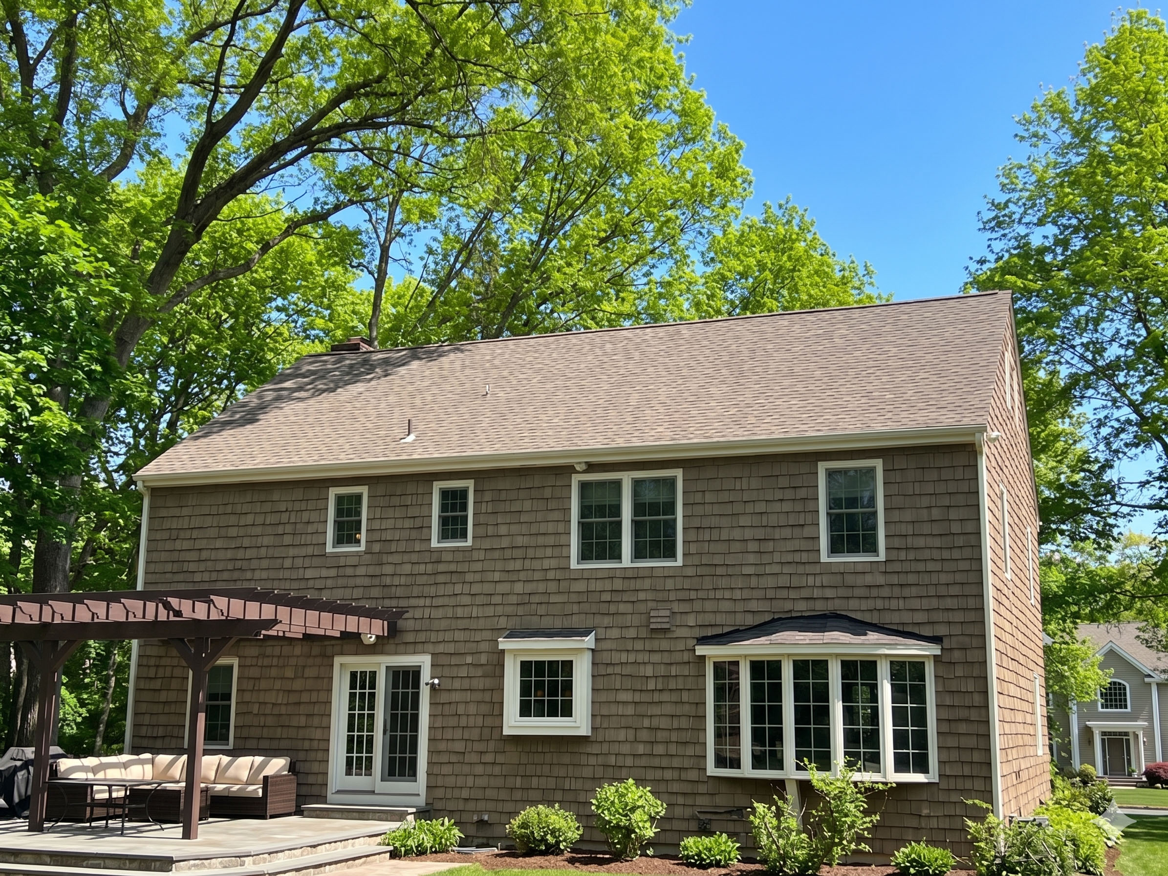 We recently headed to Stamford, CT, to provide this beautiful home with a top-tier exterior upgrade. Our crew executed a full tear-off and meticulous inspection, ensuring the roof’s structural integrity before installing high-performance GAF Timberline UHDZ shingles in the classic, warm Shakewood tone.